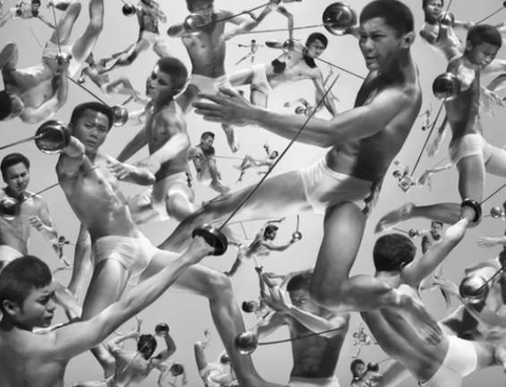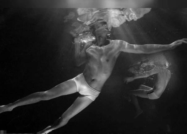 在这组“自我之战”的大片中,只见大黑牛李晨和自己的分身在水下赤裸上身,只穿一条内裤遮羞↓