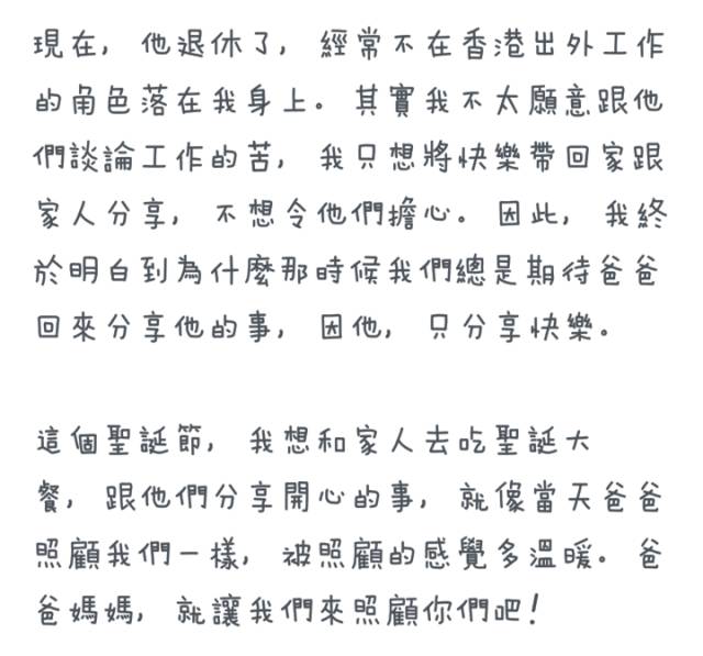 “我没自信,每次我穿一套衣服,我问她,行不行?她说行。人越大越需认同,是需要自己爱的人认同最重要,感谢你陪我长大。我会跑快点,跑到我们的终点,我爱你,多谢你的耐性。”