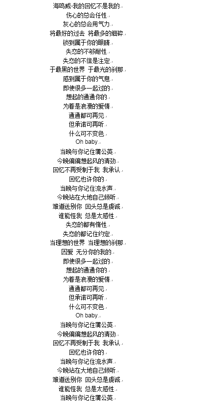 【原创歌曲介绍】海鸣威-我的回忆不是我的 温情老歌曲库 内地男星 2018-04-17 16:17:55 468 创作不易,用心坚持,欢迎请BaGua喝几杯爱心咖啡!打赏并支持本文 打赏并删除本文 《我的回忆不是我的》是一首流行风格的歌曲,是海鸣威专辑《我的回忆不是我的》里的一首同名歌曲。 创作不易,用心坚持,欢迎请BaGua喝几杯爱心咖啡!打赏并支持本文 打赏并删除本文 感谢您的支持鼓励,我会继续努力的!文章地址:用户邮箱:打赏金额:USDT 请输入数字点击”去打赏“,即可进行打赏支持本文章哦 海鸣威 About the Author 温情老歌曲库 功能介绍:每天为您送上一首经典老歌曲。 Related Posts 【原创歌曲介绍】崔子格-卜卦 2018-04-18 08:30:48 【原创歌曲介绍】胡彦斌-你要的全拿走 2018-04-17 16:17:55 【原创歌曲介绍】海鸣威-我的回忆不是我的 2018-04-17 16:17:55 发表评论