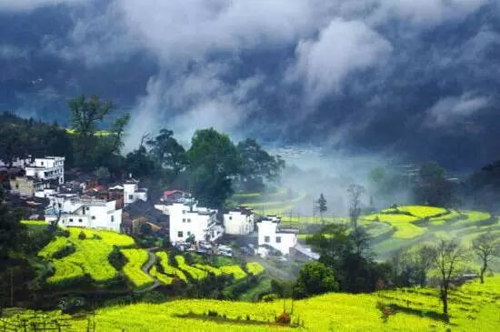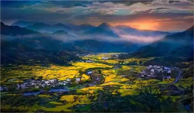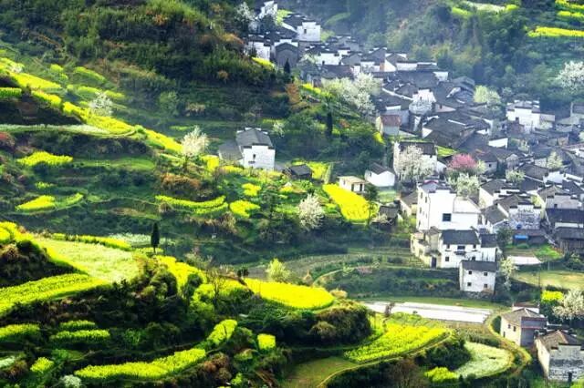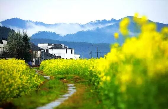 江岭的花海之中,远近错落着白墙黛瓦的徽式民居,村庄飘起的袅袅炊烟,溪边浣洗的村妇,田园里耕种的农人,暮色里放牛归来的牧童 ... ...,无不到处充满着生活的气息。