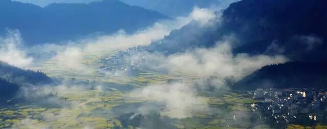 江岭因地势海拔近千米,温度相对偏低。早晨的山谷里容易起雾。在明媚的春天里,天边的云海与山谷里的雾海共同笼罩着山谷里黑白的民居、金黄的花海,若隐若现,似人间仙境。