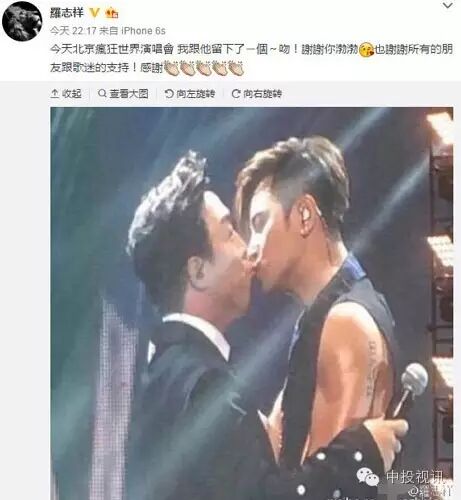 罗志祥还晒出和黄渤的激吻图,附文称:“今天北京疯狂世界演唱会 我跟他留下了一个~吻!谢谢你渤渤,也谢谢所有的朋友跟歌迷的支持!感谢!”