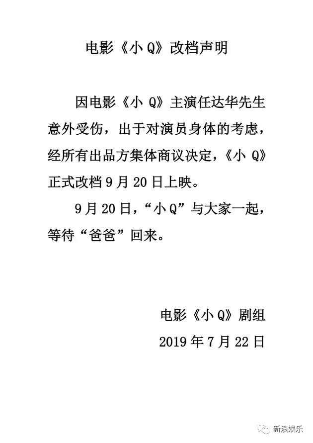 昨天,由任达华主演的电影《小Q》片方宣布电影将会推迟到9月20日上映。