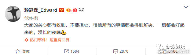 昨晚赖冠霖更新微博,对粉丝说“不要担心,相信所有的事情都会得到解决,一切都会好起来的”,算是给粉丝打了一剂强心针。