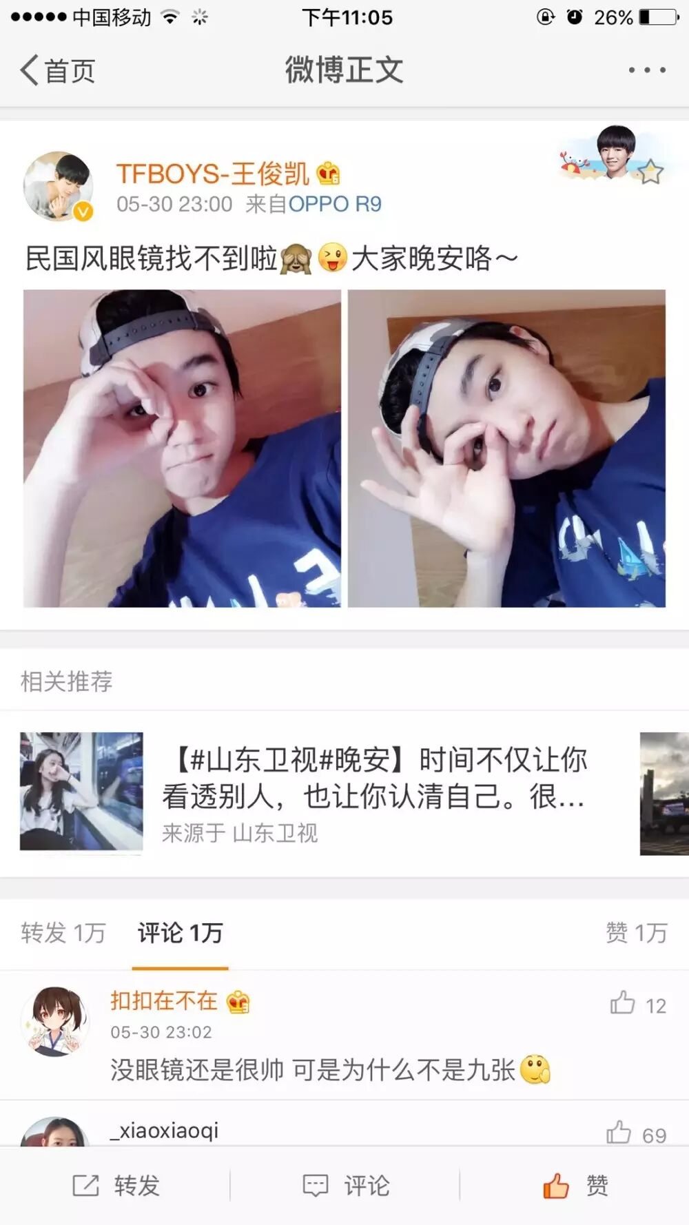 TFBOYS王俊凯更博 久违的自拍啊 TF四叶草后援会 内地男星 2016-05-31 21:41:55 375 创作不易,用心坚持,欢迎请BaGua喝几杯爱心咖啡!打赏并支持本文 打赏并删除本文 TFBOYS微信号:TFBOYS13580【四叶草们】 这里是TFboys最新讯息,我们会第一时间通知您【更多动态】 小凯QQ:1958589274 同步更新全网首发:TFBOYS,转疯了!!!满满的爱,非常用心的制作。民国风眼镜找不到啦[挤眼]大家晚安咯~为了更好的宣传TFBOYS,看完之后请点赞或把它分享到你的朋友圈吧。家人们:每天为三只做点事:家人们把看到的图文多多分享给身边的好友,帮三只多多宣传,三只爱你们~么么哒四叶草十年之约推荐人气最强组合公众微信:TFBOYS13580 创作不易,用心坚持,欢迎请BaGua喝几杯爱心咖啡!打赏并支持本文 打赏并删除本文 感谢您的支持鼓励,我会继续努力的!文章地址:用户邮箱:打赏金额:USDT 请输入数字点击”去打赏“,即可进行打赏支持本文章哦 王俊凯 About the Author TF四叶草后援会 功能介绍:TFBOYS家族粉丝团,TFBOYS王俊凯,TFBOYS王源,TFBOYS易烊千玺,TFBOYS组合最新动态.王俊凯QQ:1958589274 官方认证:深圳市龙华新区知日信息咨询中心 Related Posts 恭喜!大哥北电艺考顺利通过! 2017-02-20 21:36:02 TFBOYS歌词大测试,来挑战一下吧! 2016-10-16 21:45:36 当红色与TFBOYS易烊千玺相遇 2016-09-02 22:01:40 TFBOYS王源 南开中学报到 2016-09-01 22:40:05 美拍直播-tfboys王源 2016-08-16 23:13:47 发表评论
