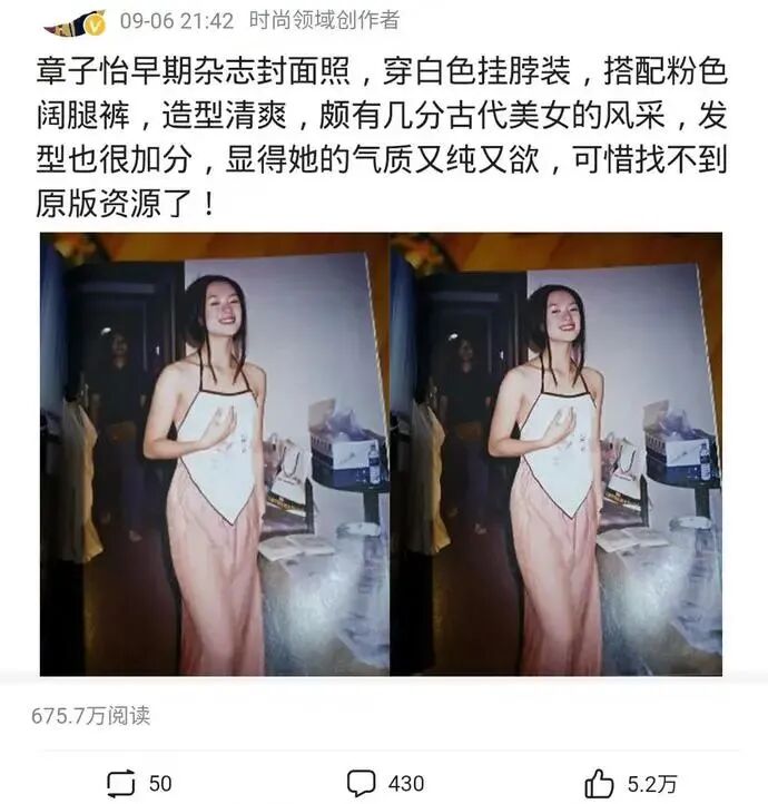 9月6日,就有一位时尚博主在网上晒出了一组章子怡早期拍摄的杂志封面,并配文“章子怡早期杂志封面照,穿白色挂脖装,搭配粉色阔腿裤,造型清爽,颇有几分古代美女的风采,发型也很加分,显得她的气质又纯又欲,可惜找不到原版资源了”,章子怡的这一组早期杂志封面火了, 阅读量超过了670万,穿衣风格引起了网友们的关注和热议。