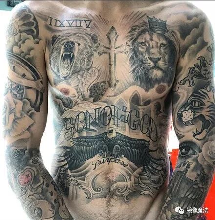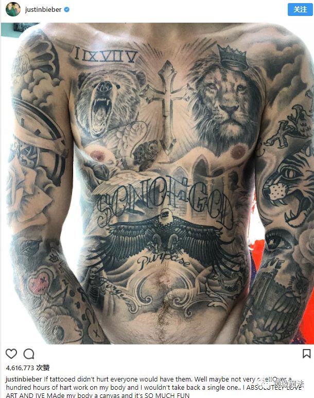 贾斯汀比伯在IG晒出一张上半身全裸的画面,只见他的身上,从锁骨往下到肚脐,密密麻麻布满了刺青图案,除了又十字架,甚至还有戴着皇冠的狮子、老鹰、“神的儿子”的字眼等,两只手臂也完全没有任何空隙。他在发文中称,如果刺青不会痛的话,大家应该都很想要,“我身体上这些是花了超过100小时才完成的,每一个都不曾让我后悔,我真的很爱艺术,我已经把我的身体变成一张油画,这真的太好玩了!”