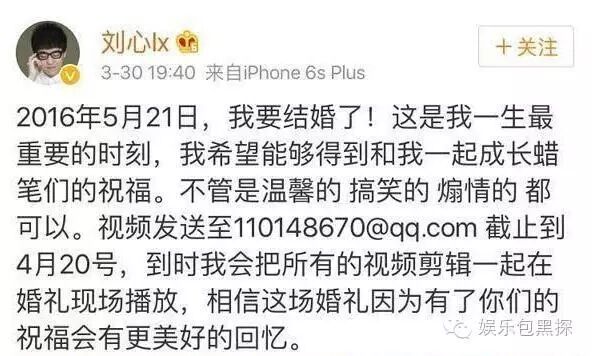 因为刘心很早就公开了恋情,并且在今年的3月份就已经在微博中公布了大婚的日期,所以很有效的避开了不必要的“隐婚”,更加不会形成像520突然公布恋情的“林心如、霍建华”爆炸性新闻了