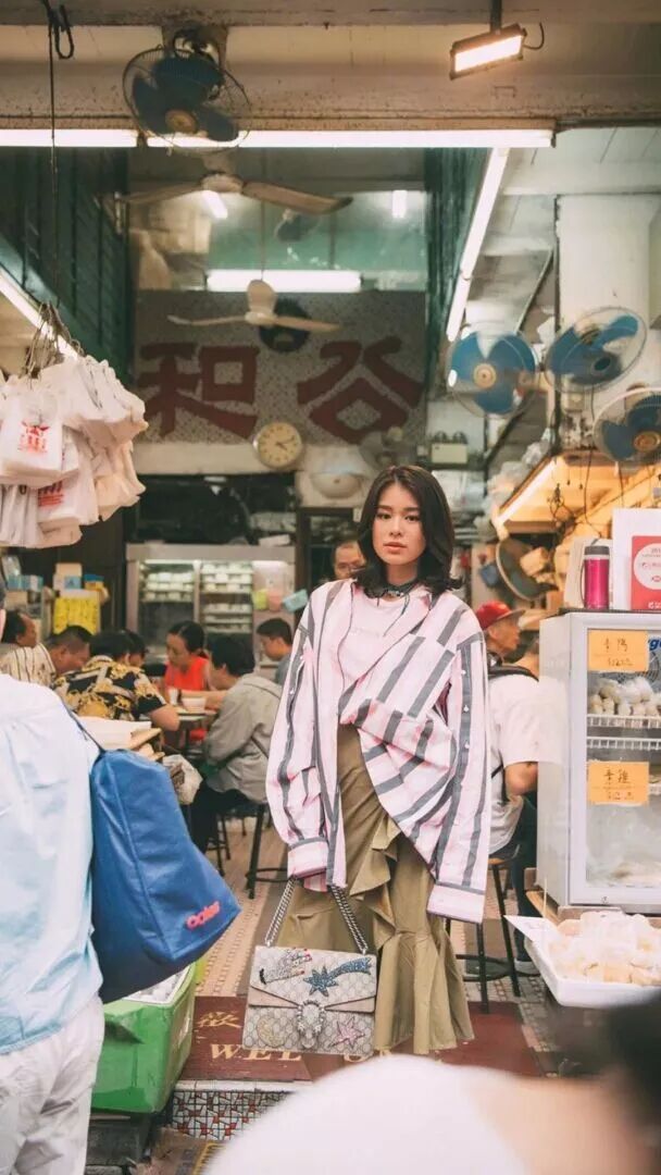 条纹宽松上衣,搭配卡其色连衣裙,大码休闲的设计,十分有型。同时搭配的一个斜挎包为自己增添了气质。