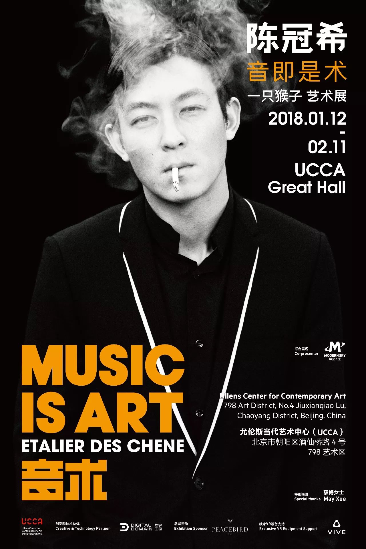 尤伦斯当代艺术中心(UCCA)与陈冠希(Etalier des Chene)和摩登天空于 2018 年 1 月12 日至 2 月 11 日期间共同呈现展览“音术”,一同探索作为艺术的音乐。对于作为音乐人的陈冠希而言,音乐作为一种重要艺术形式的本质正在一个日渐商业化的社会中逐渐被遗忘。适逢其新专辑《一只猴子 第一部曲》发布之际,展览“音术”将展出 22 件艺术作品,其中包括由陈冠希自己独立创作或与其敬仰的艺术家合作创作的作品以及陈冠希个人收藏的艺术作品,而每一件特定的艺术作品都与新专辑中的一首歌曲相呼应。