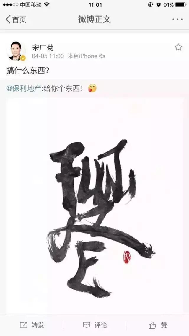 其二:今日保利地产董事长宋广菊女士又发了一条微博,转发了一张看不懂的字并配文“搞什么东西”而大火,全国媒体纷纷猜测其深意。不得不说,这又是一次出色的营销。