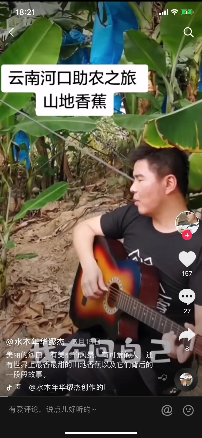 一开始在微博,抖音火了就去抖音,纵然粉丝不多,但田间地头,总能看到他抱着吉他的身影。