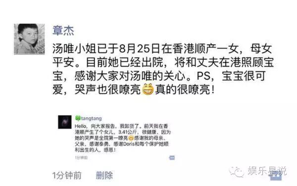 网上看到消息:8月27日晚上,汤唯的宣传章杰晒出朋友圈截图,宣布汤唯已于8月25日在香港产女,3.41公斤,母女平安。目前,汤唯已出院,将和丈夫在香港照顾宝宝。2月26日,汤唯在朋友圈公布怀孕喜讯,称:“泰勇和汤汤开春来报喜,我们正在等一只调皮小猴子的到来”,并配上一张呆萌小猴的水墨小画。随后,谈汤唯所在的经纪公司安乐电影在其官微晒出朋友圈截图,证实喜讯,并送上祝福。不能不说的是,汤唯怀孕起好像一直很低调,或者对于她们来说需要的只是做母亲之后的喜悦吧?