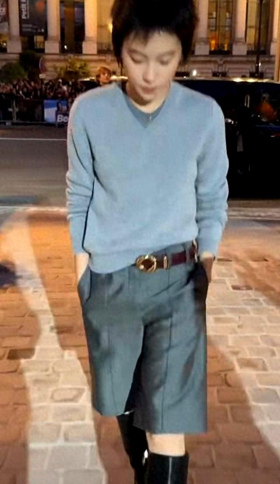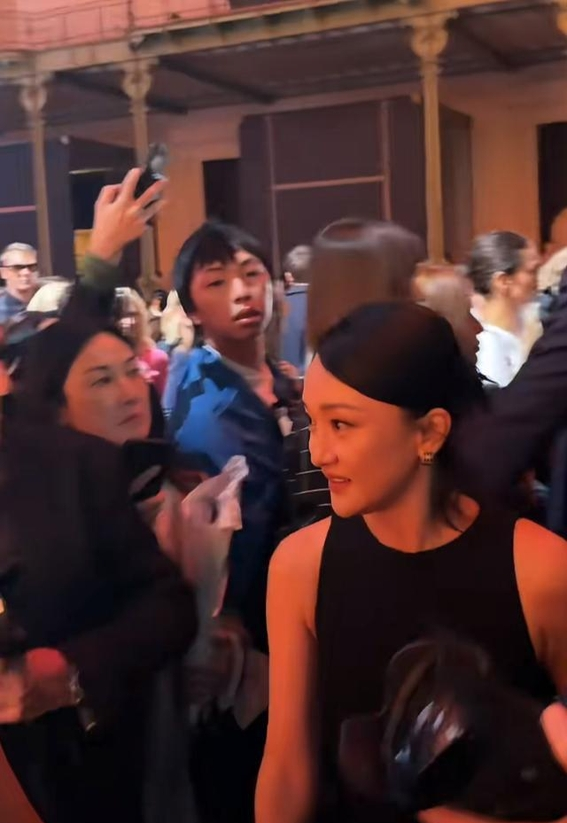 巴黎秀场人比地铁还挤,黑压压一片,窦靖童一身灰黑打扮,西装短裤加长靴,跟街头走秀似的。