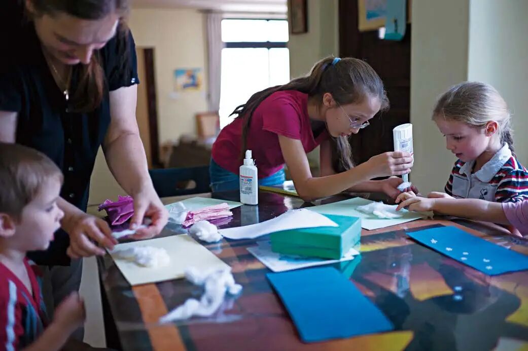 母亲迪雅和孩子们在家里的餐桌上一起做手工。