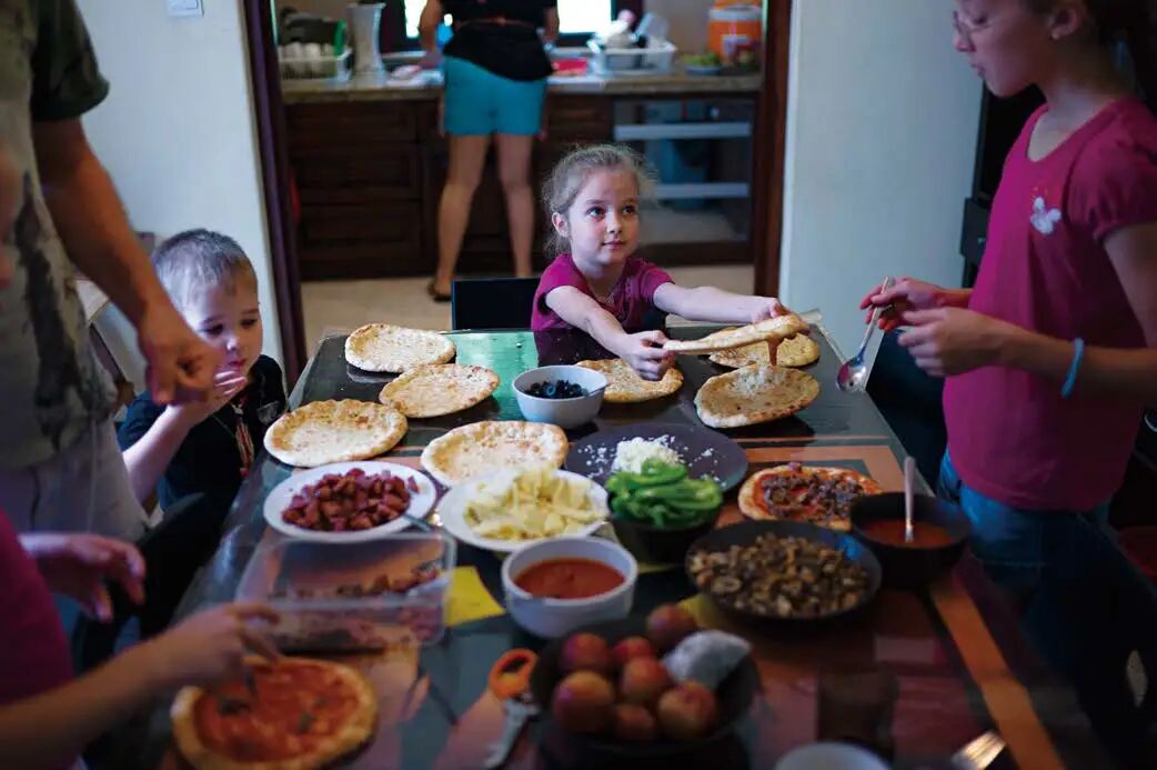 10个孩子的午餐。比萨是用买的馕饼做底,上面由孩子们依次涂抹自己喜欢的食物。