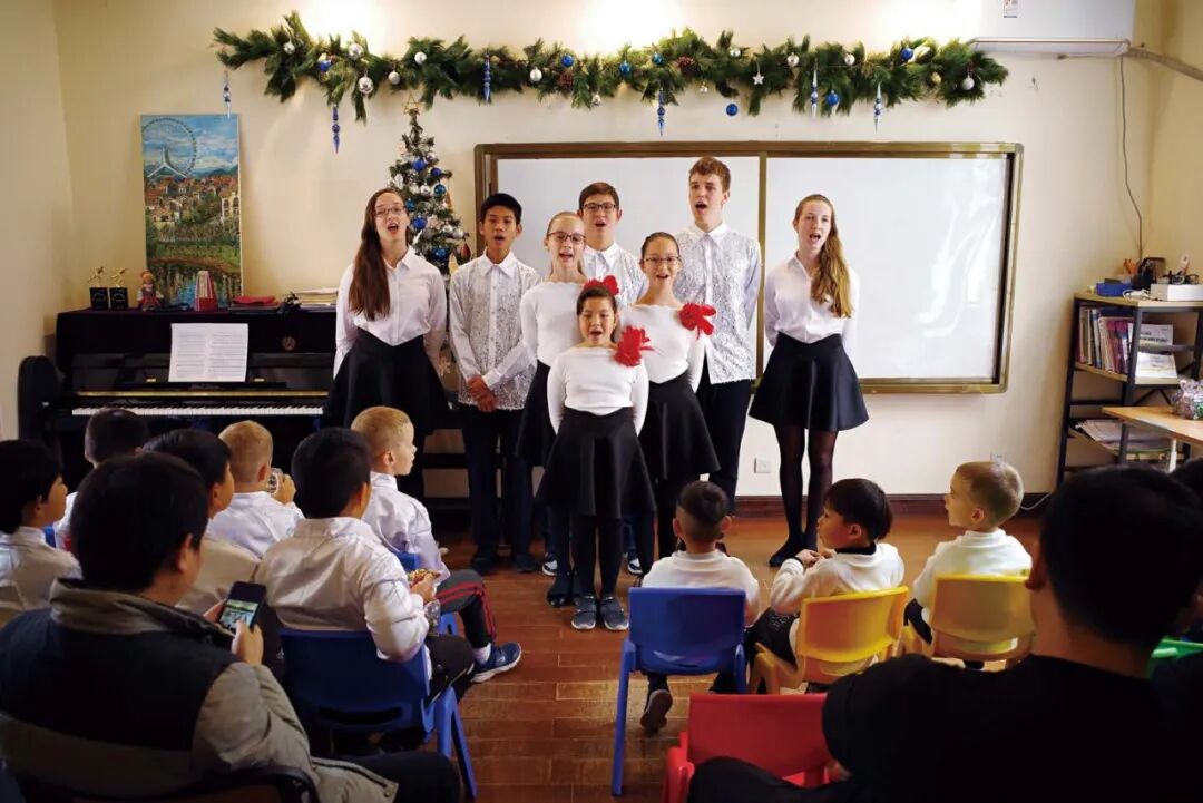国际学校圣诞餐上,高年级同学为低年级同学表演节目。
