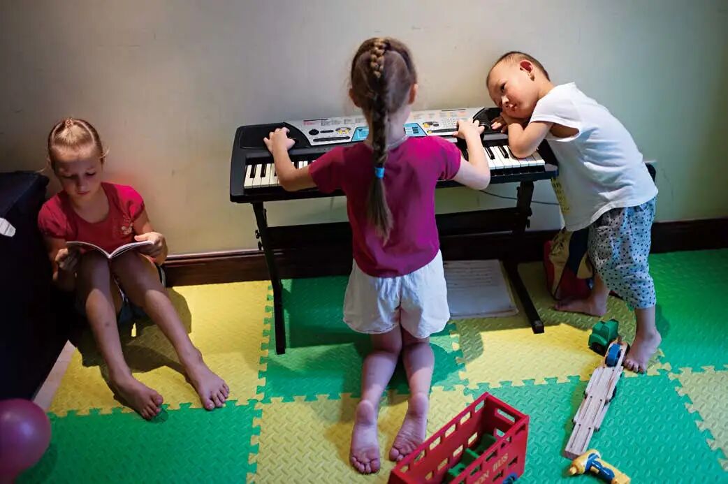 邻居家的儿子看着四女儿索菲亚演奏电子琴,三女儿卡瑞娜在一旁看书。