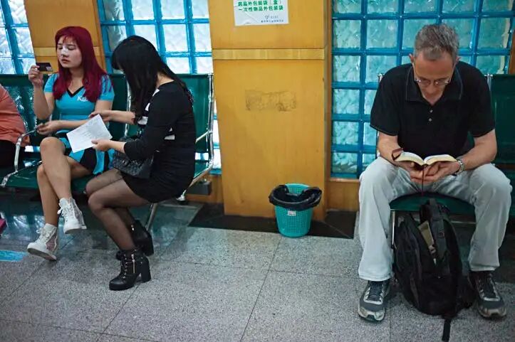 2015年4月2日,丹尼尔在广州南方医院做兔唇手术。手术室外,父亲怀特为孩子祈祷。旁边来自湖南的姑娘刚做完垫鼻梁的美容手术。