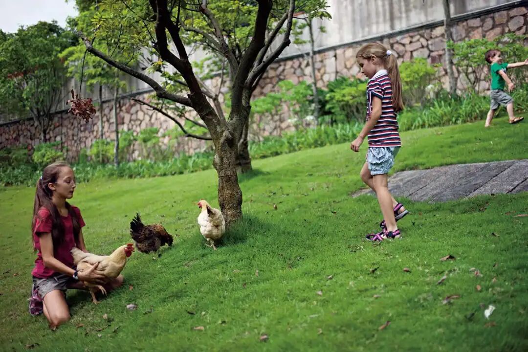 二女儿玛丽安吉拉和四女儿索菲亚给母鸡喂食。