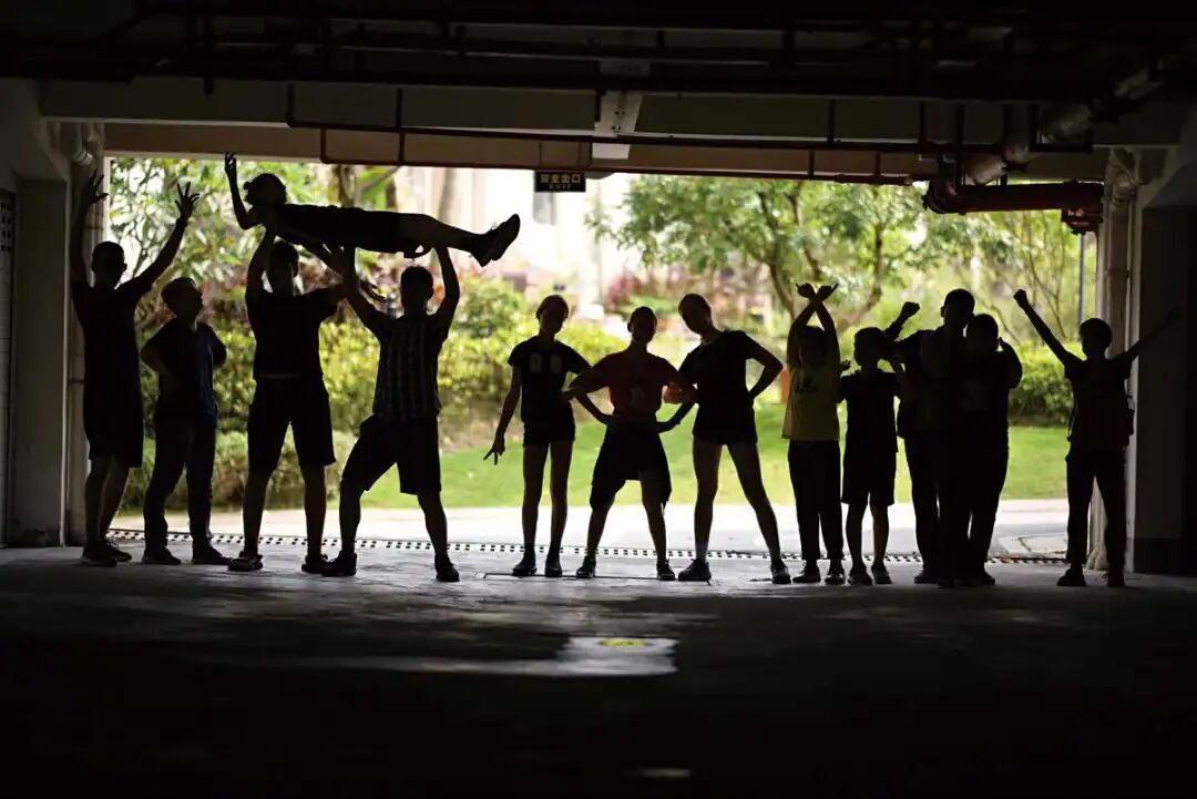 国际学校毕业季上,高年级的同学们在地下车库拍摄合影。