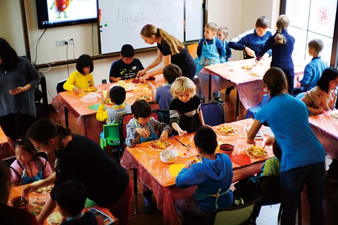 国际学校一学期典礼,大家一起自制比萨。低年级同学负责磨碎奶酪等,高年级同学负责烘焙。