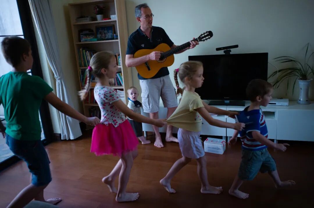 孩子们玩跑火车游戏。广东清远,怀特家的客厅里,怀特弹着吉他和孩子们玩跑火车游戏。