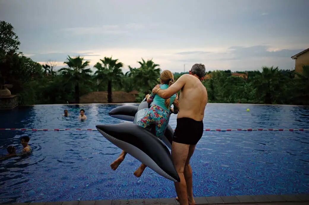 三女儿卡瑞娜骑在自己吹好的海豚救生圈上,被父亲怀特扔进泳池里。