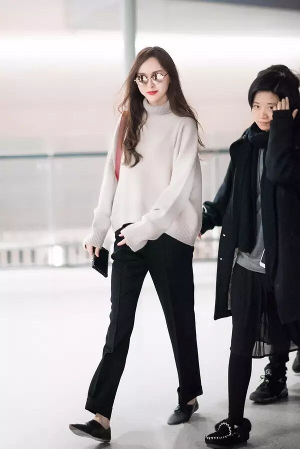唐嫣最近现身机场,高领毛衣烟管裤搭配上时下潮流的奶奶鞋,也是美的不要不要的呢!
