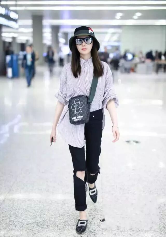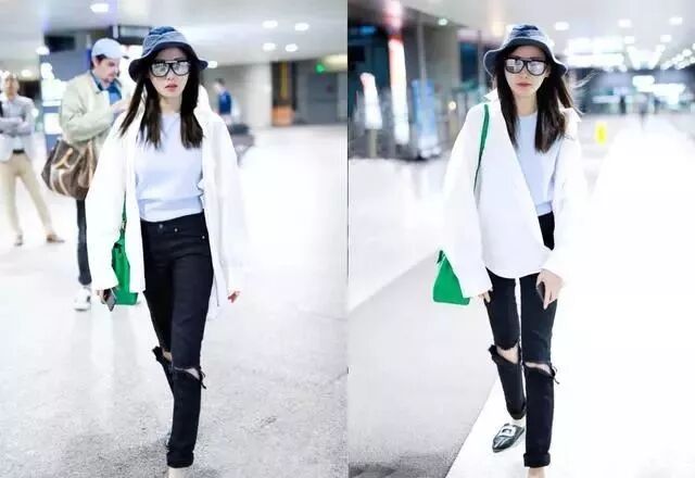 张天爱的机场私服,真的是有着360°的大转变,头上戴着一款渔夫帽,佩戴只有反光的墨镜,依旧是披着一头棕色的长发,身上穿着一件白色衬衫,那穿蓝色的打底衫,下半身一条黑色破洞紧身裤,直接穿出了一米八的气场。