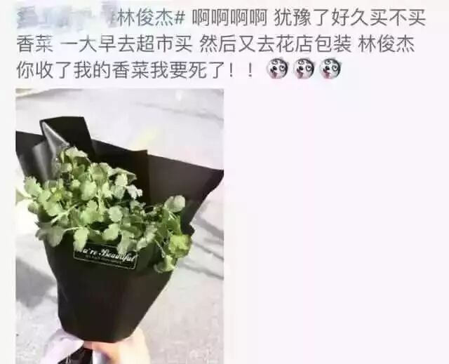 林俊杰也曾被粉丝送过一把香菜,还包装得特别好看,看着都有种是满天星的错觉。