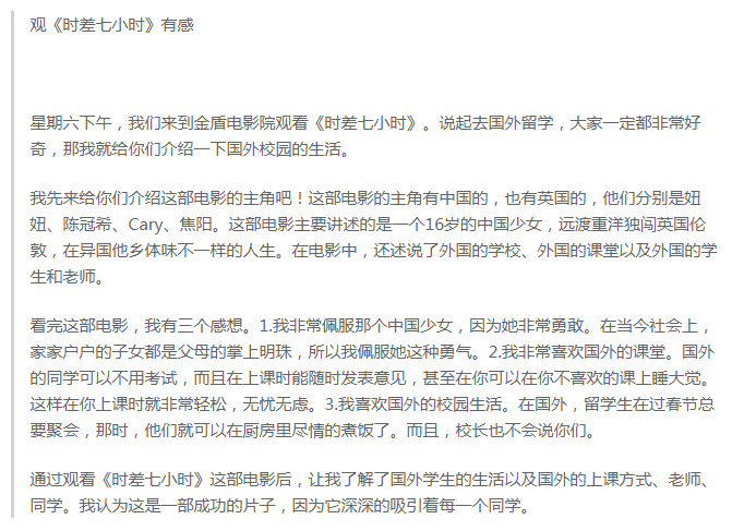 关键是学校还强制要求学生们写一份400字真情实感的《时差7小时》电影观后感。