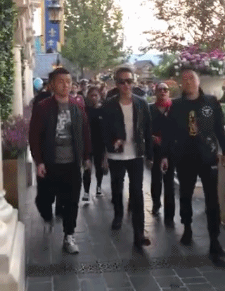 超哥穿着和俪姐同色系的黑色外套和裤子,戴着墨镜走路带风。