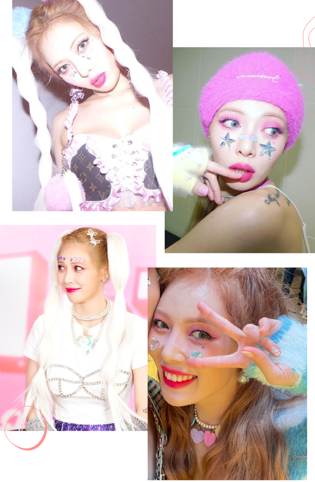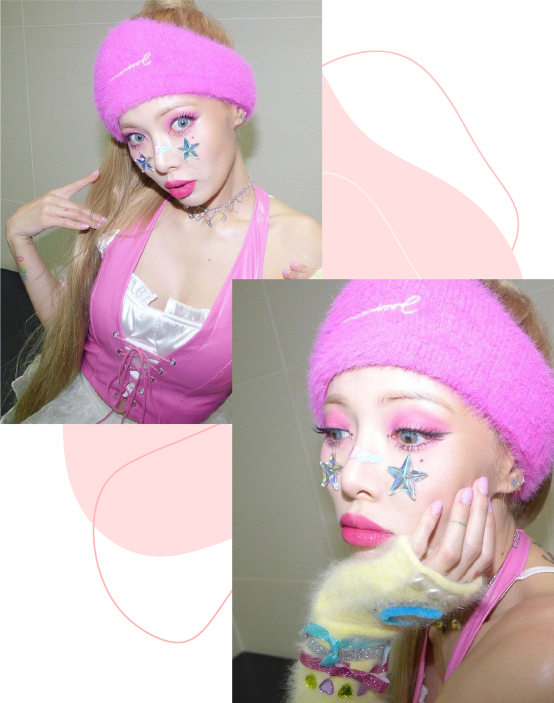 而在MV中有一两个造型,泫雅也有贴类似的粘纸作为装饰,都是小小的款式。