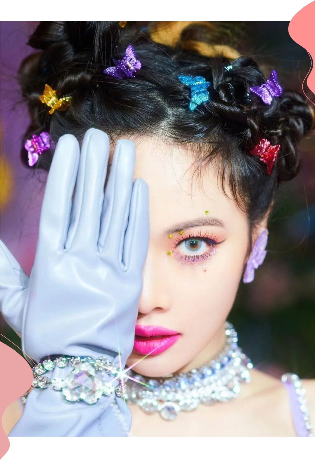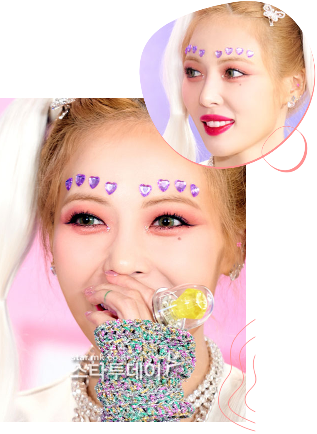 在新歌发布会上,泫雅就在眉毛上方贴了一排紫色爱心宝石。别说,还真挺好看的诶!毕竟wuli小野马什么造型都hold得住!
