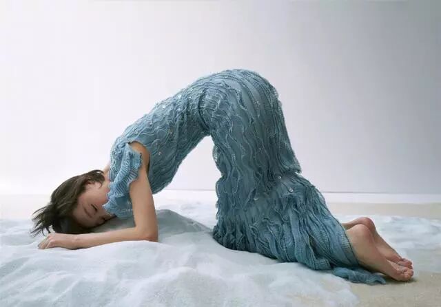 下面这两张怪异的姿势就让人看不懂了,原本躺在地上的她想要站起来,但是双脚不用劲,而是靠着膝盖和头部力量支撑,这一动作连拍下来有种孤立无援的感觉。看似简单到不行的动作,被放慢加大难度后倒是很有震撼力,看得人都想帮她一把了,不知道这样拍出来是想表达什么呢?