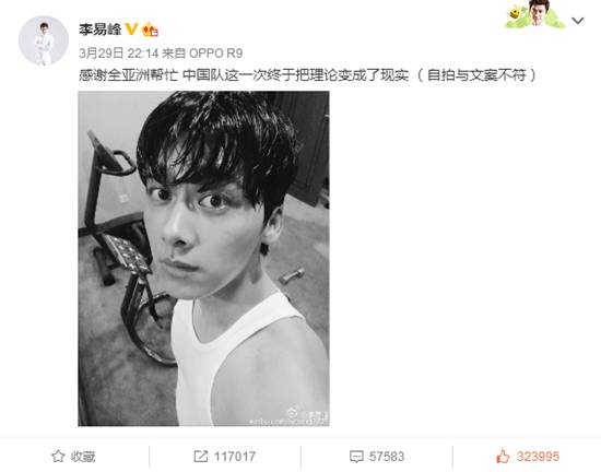 李易峰:感谢全亚洲帮忙 中国队这一次终于把理论变成了现实
