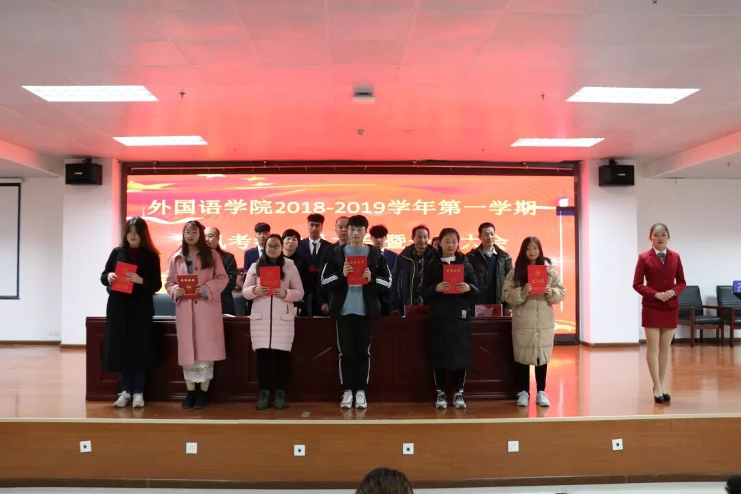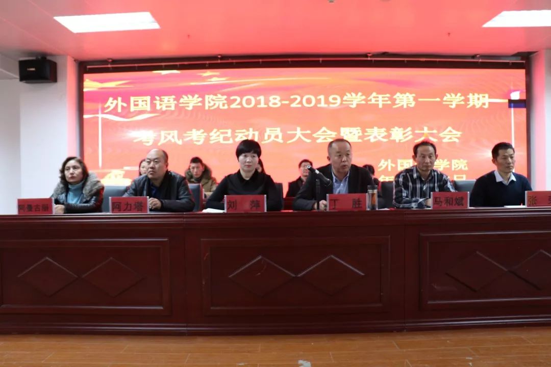 为表彰肯定先进集体和个人,营造外院同学向优秀学生奋发学习的良好氛围,同时,为即将到来的期末考试肃清考试风气,端正学生的考试态度。外国语学院于2018年12月25日晚7点30分在图书馆负一楼就业大厅召开2018─2019学年第一学期考风考纪动员大会暨表彰大会。本次大会由外国语学院党委副书记刘萍主持,外国语学院党委书记丁胜、副院长马和斌、副院长张荣、组织员阿力塔、教学管理办公室主任李东海、团委副书记袁嘉、政治辅导员康维华、董岩、卡木冉,新疆籍内派教师阿曼古丽、科研干事马晓燕出席本次大会,外国语学院全体同学参加。