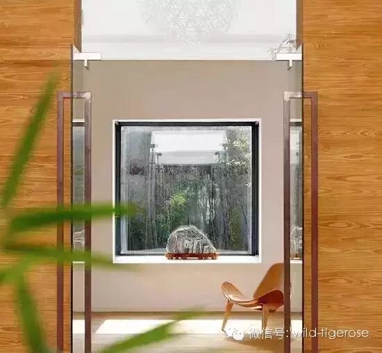 改造后的门厅。大幅、通透的玻璃门,让空间采光十足。更可贵的是,门后没有被整面的白墙遮挡,而是一扇小窗,露出了后面翠绿的竹林。刻意的设计让空间更有通透感,而且诗意盎然。