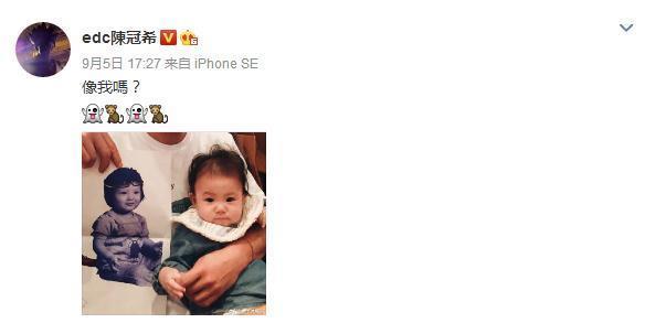 虽然二人还不是合法夫妻,但陈冠希很自然很顺口地用“老婆”来称呼秦舒培,谈到女儿像谁,他是这样回答的:“我觉得比较像我,也有人说我像我老婆,我无所谓。”真是口不对心的男人!陈冠希嘴上说“无所谓”,其实明明很在意,之前他就晒出自己童年跟女儿的对比照,问网友:“像我吗?”