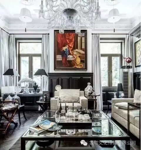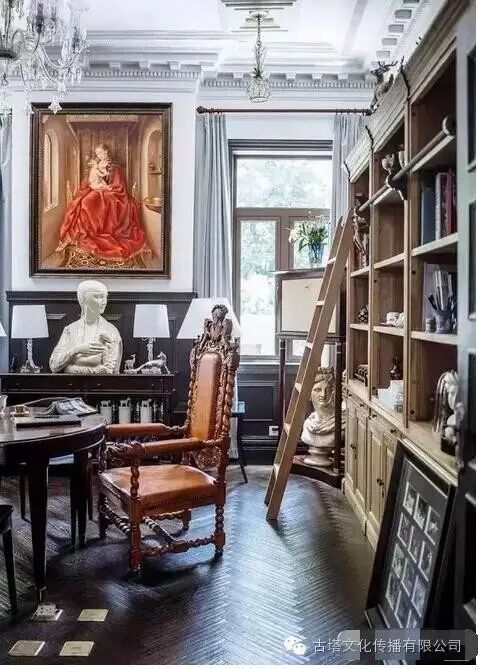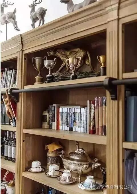 奢华大气的巴洛克水晶灯,深棕色实木家具,爱马仕墙纸,各种各样的杯盏交错都完美地呈现了一个复古宫廷的书房风格。
