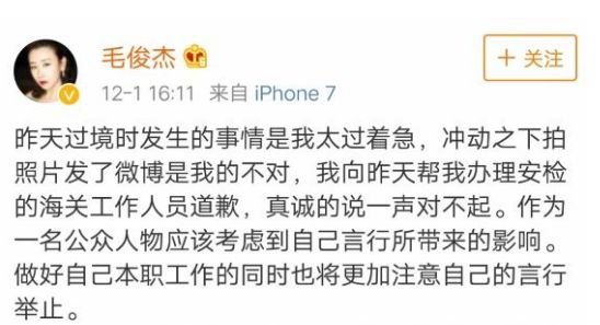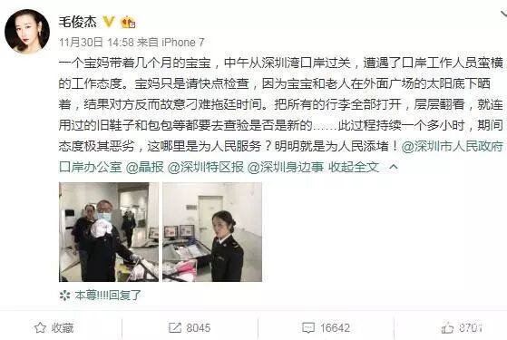 2018年11月,演员毛俊杰在社交平台发文怒斥深圳海关工作人员刁难带着几个月宝宝的她,检查行李时间长达一个小时,工作人员态度恶劣,并晒出了对方的照片。