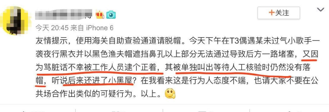 还有目击的网友称因为曾轶可因为渔夫帽遮住半张脸而无法过检,坚持不肯落帽、骂人等行为导致后方通过的人群堵塞。