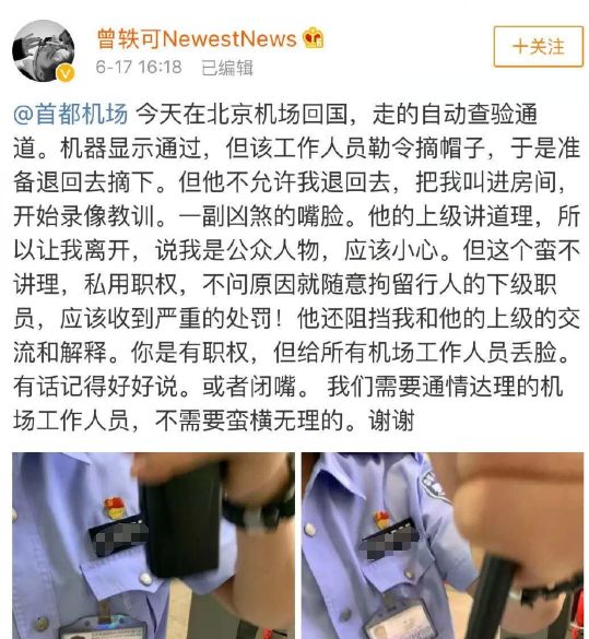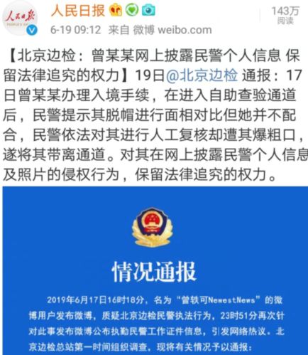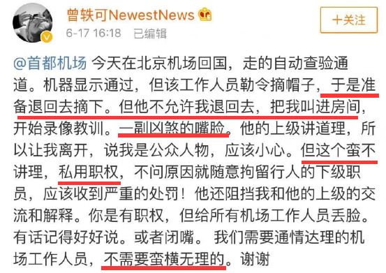 看到这里,真相大白,曾轶可在过边检时不主动除帽,拒不配合工作人员的检查,在接受人工检查时出言伤人,之后还在社交平台发布工作人员个人信息。