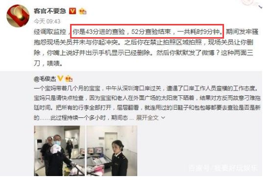 但随后不久,当时的视频就正式曝光,结果显示,从监控来看检查的时间一共才9分钟,期间也并未发生争执,反而是毛俊杰在不被允许拍照的区域偷拍工作人员,还将照片公布在网上。