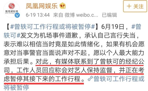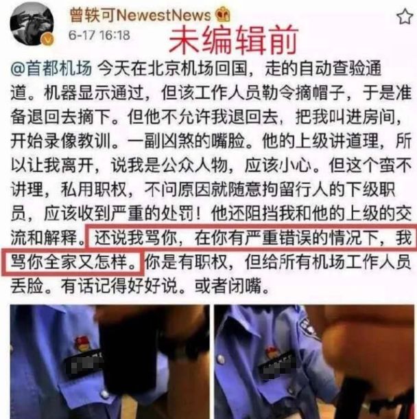 曾轶可辗转两天后的这份道歉也被认为更多是碍于舆论压力,因为在她的道歉发出前,北京边检对其6月17日的事情经过进行了通报。