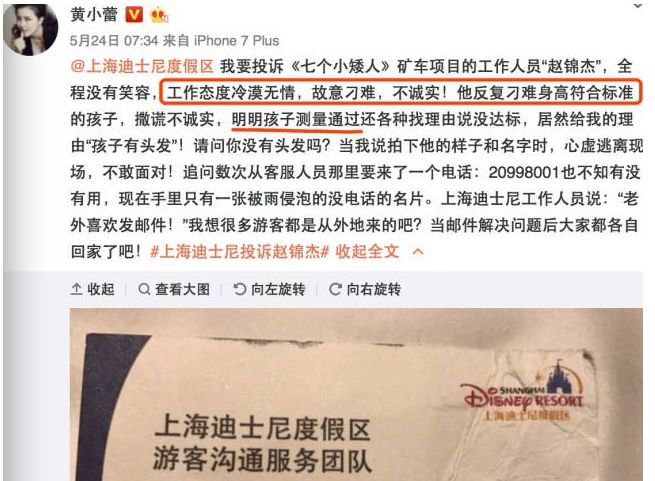 演员黄小蕾因为女儿身高不够不能乘坐游乐园的游戏设施而不满,在网上声讨游乐园工作人员态度冷漠故意刁难。