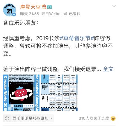 此外,曾轶可所在的经纪公司摩登天空已经公开发表声明:曾轶可将不出席2019年的长沙草莓音乐节,并且接受乐迷的退票处理。