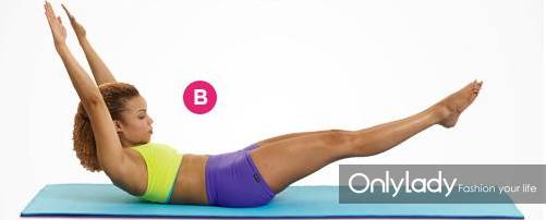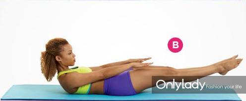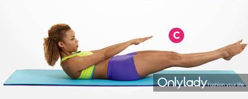 吸气的同时,松开双手向后延展,两腿保持并拢向地板方向延展,让腹部和脊椎都同时得到锻炼;