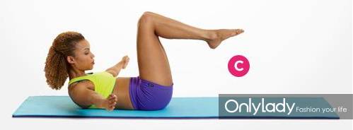呼气的同时,再度曲起膝盖,同时两只手臂朝身体两侧平举,让腹肌进一步得到锻炼。
